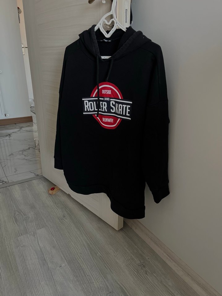 Siyah, baskılı ve sweatshirt. Bol kesim, uzun kollu, yuvarlak yaka . Spor ve günlük kullanıma uygundur.