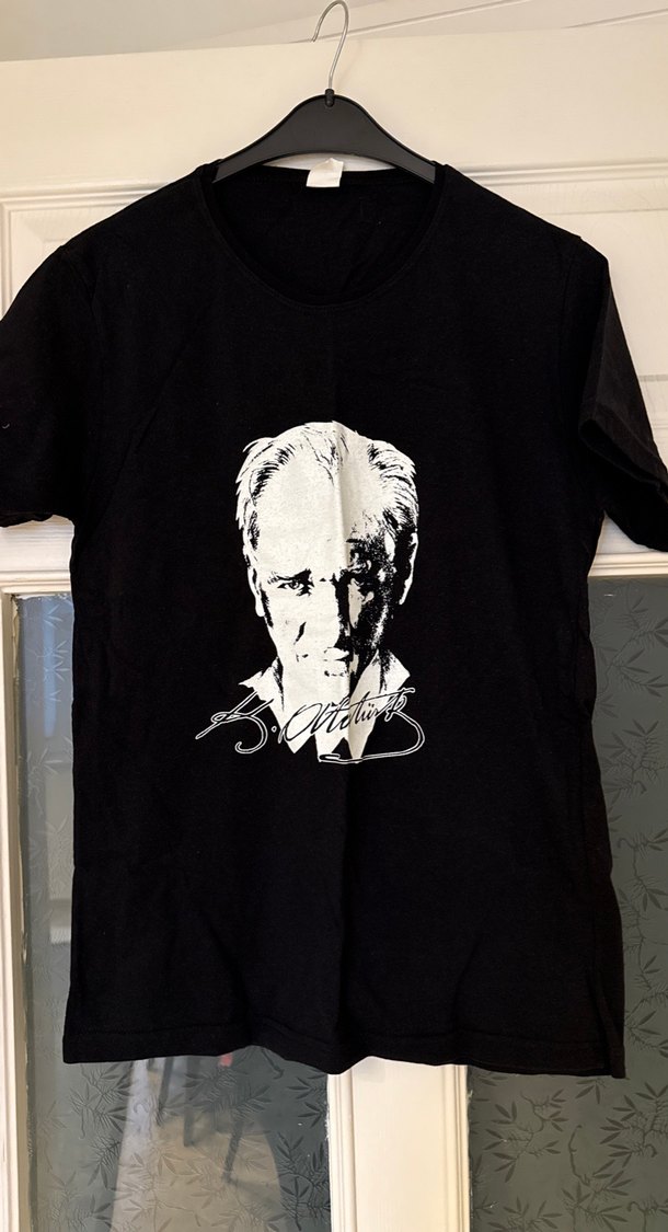 Pamuklu, kısa kollu, siyah tişört. Önünde baskılı portre ve imza detayı bulunur. M bedendir