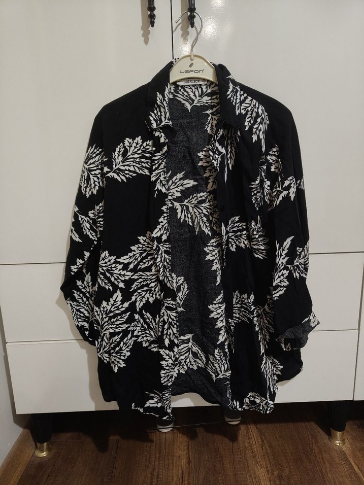 Uzun kollu, salaş kesimli siyah batik desenli kimono. Notlu yaka ve dökümlü yapısıyla günlük kullanıma uygundur.