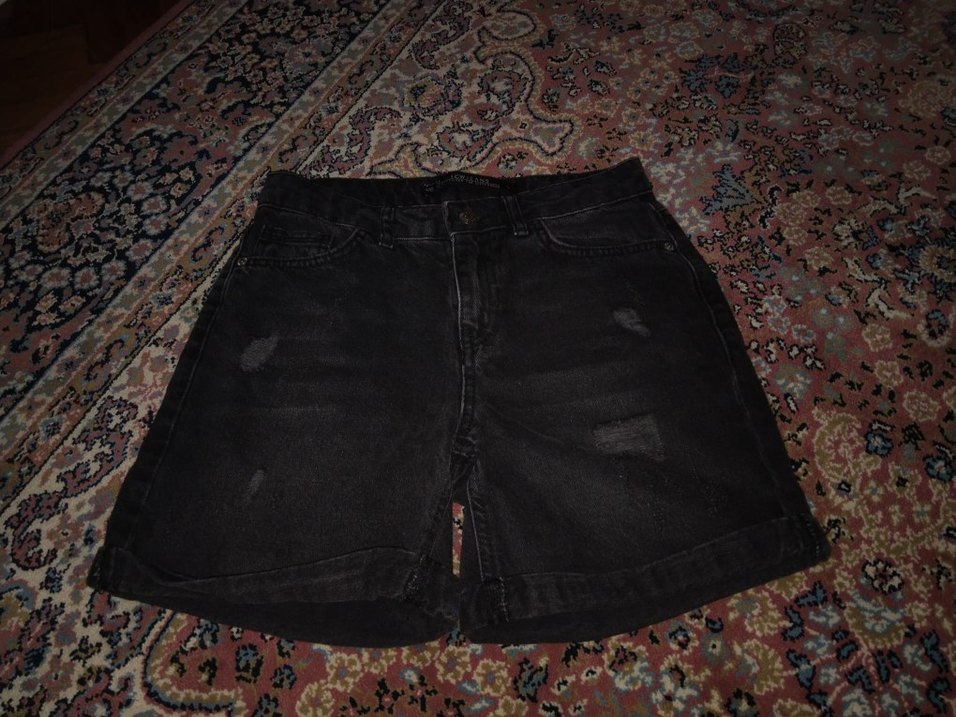 Siyah batik desenli, gevşek kesim kot şort, tokalı detaylı. Grunge ve sokak stili için uygun, günlük kullanıma ideal.