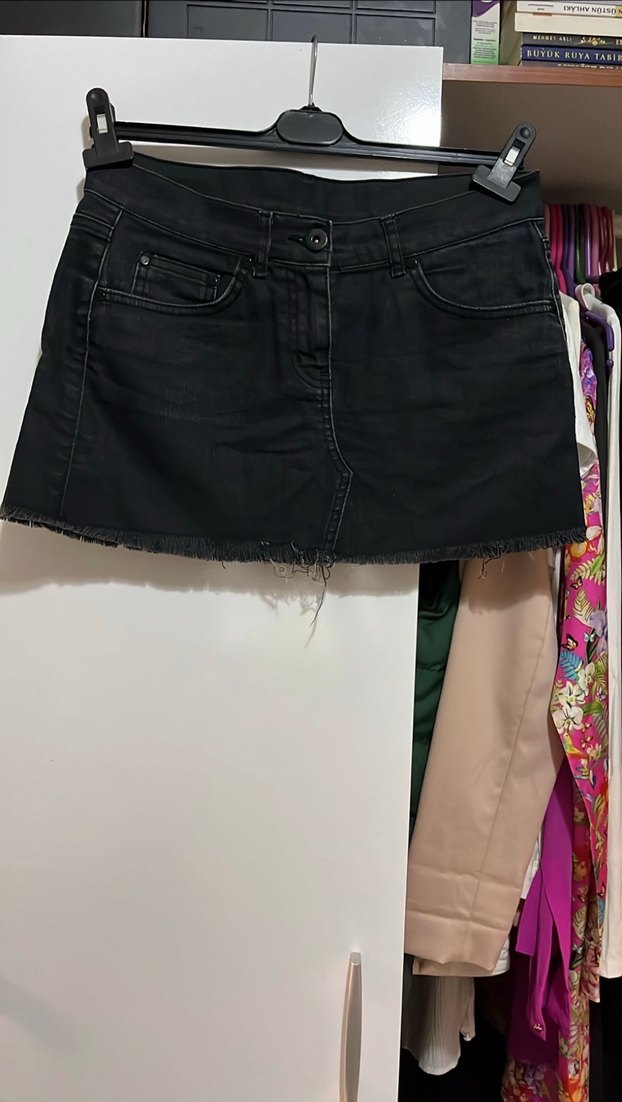 Kemerli ve siyah batik desenli, kot kumaştan yapılmış, sıkı kesim mini etek. Günlük kullanım için uygun, trend bir tasarım.