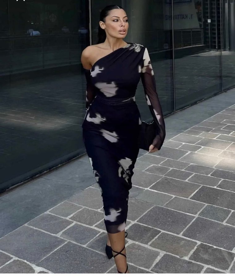 Bu dar kesim uzun elbise, siyah batik desenli, romantik akşamlar için ideal. Sadece 1 davette kullanıldı.