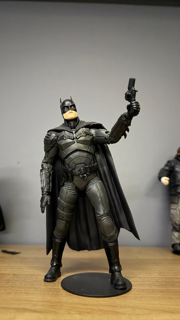 Detaylı zırh ve akan peleriniyle siyah Batman aksiyon figürü, elinde bir cihaz tutuyor. Karanlık tonlar karakterin ikonik görünümünü vurgular.