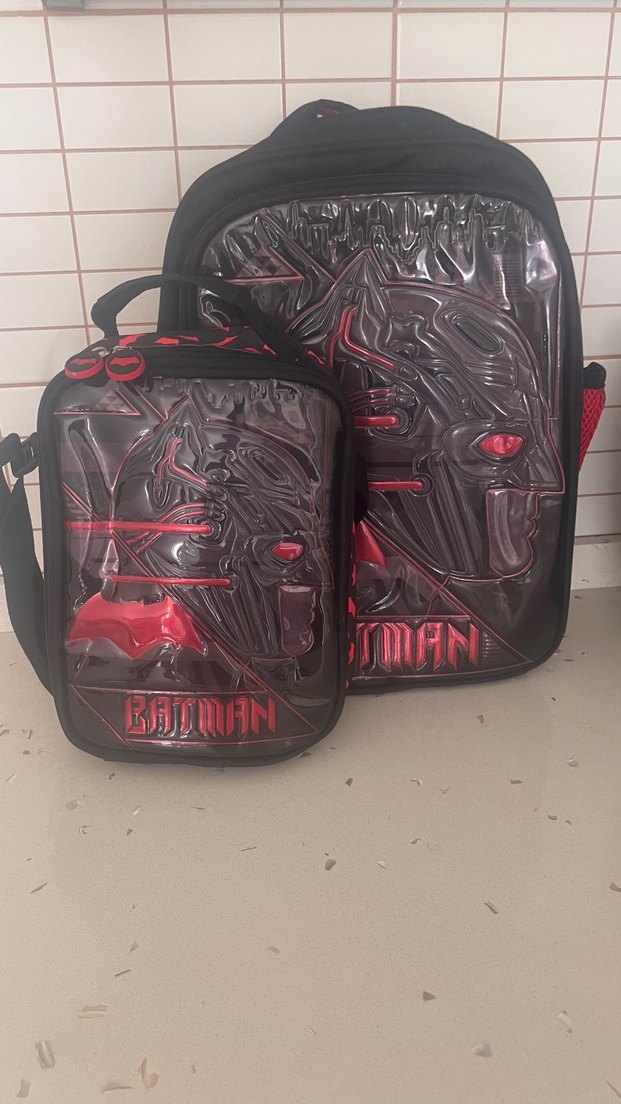 Kırmızı detaylı Batman desenli siyah çocuk okul çantası seti. Sırt çantası ve küçük çanta olarak iki parçadan oluşur.