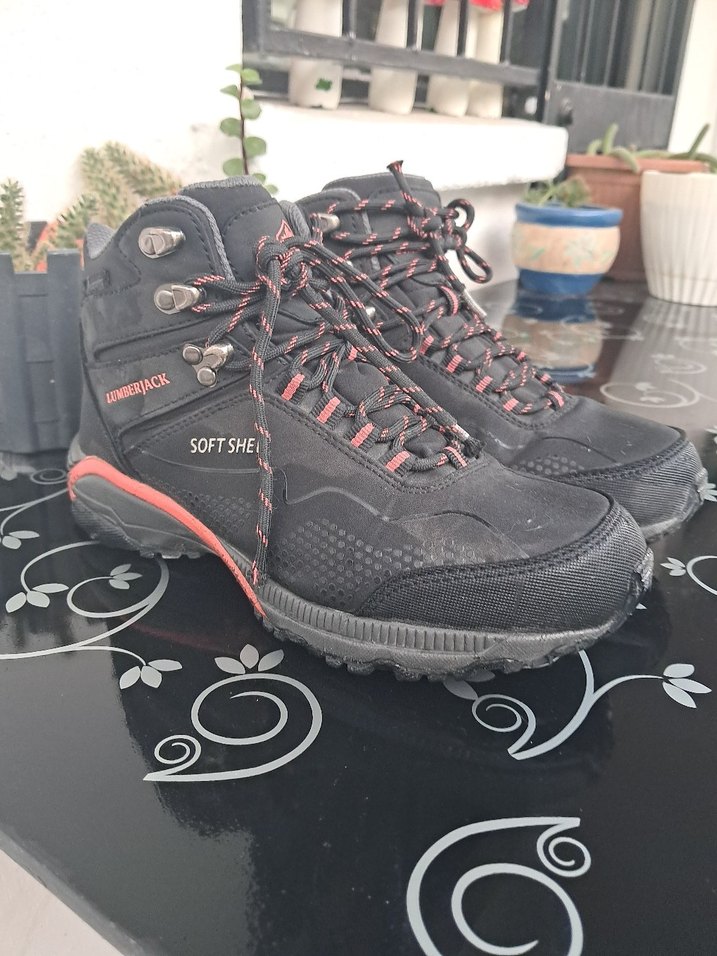 Siyah kauçuk malzemeden yapılmış, baskılı detaylı ve Velcro özellikli bay bayan outdoor botları. Sokak stili ve athleisure için uygun. Marka adı 'SOFTSHEI' görünür.