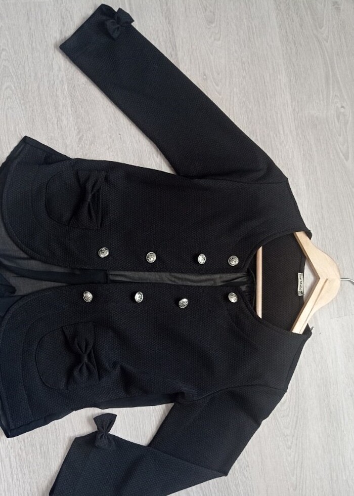Özel günler için uygun abiye şık bir ceket sayılı giyildi yeni gibi tertemiz deformasyon yok arkası şifon siyah renk bayan ceket beden 44 yazıyor ama dar kalip ölçüleri fotoğrafda mevcut