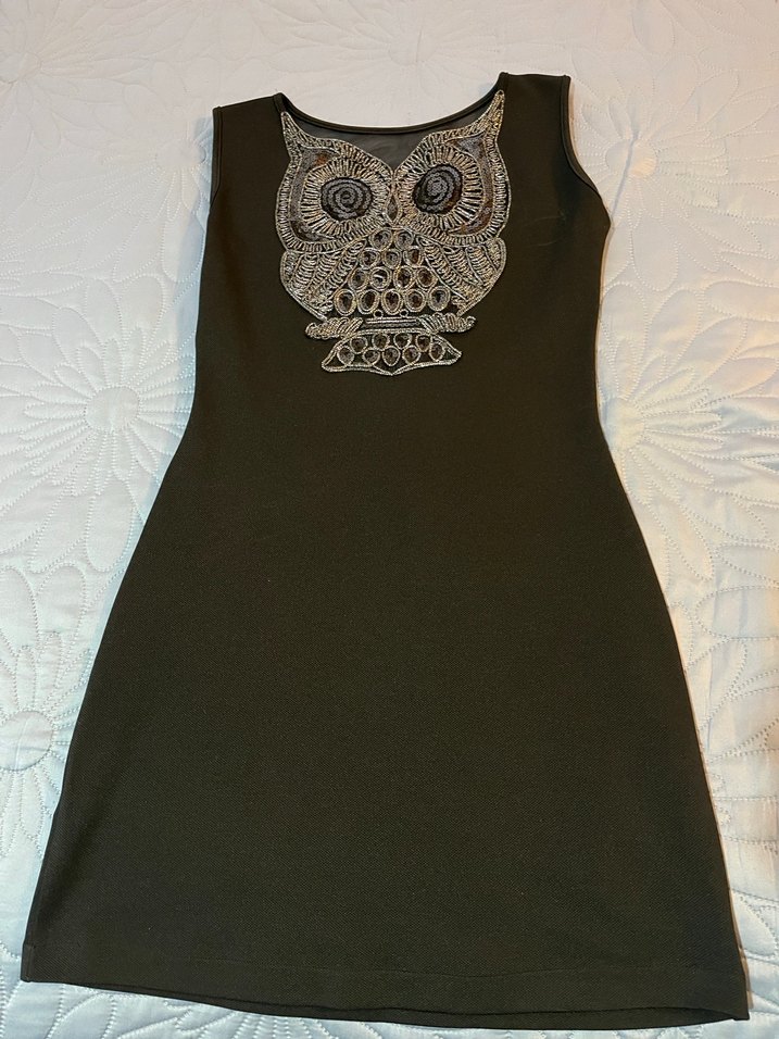 Fitted kesim, kolsuz siyah elbise, göğüs kısmında detaylı baykuş işlemeli, gotik ve bohem tarzları birleştirir.