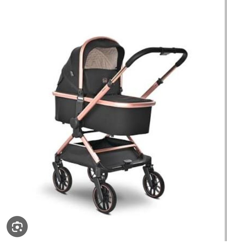 Siyah bebek arabası, dayanıklı çerçeve, konforlu beşik ve ayarlanabilir tutma kolu ile düzgün hareket sağlar. tüm parçaları vardır.