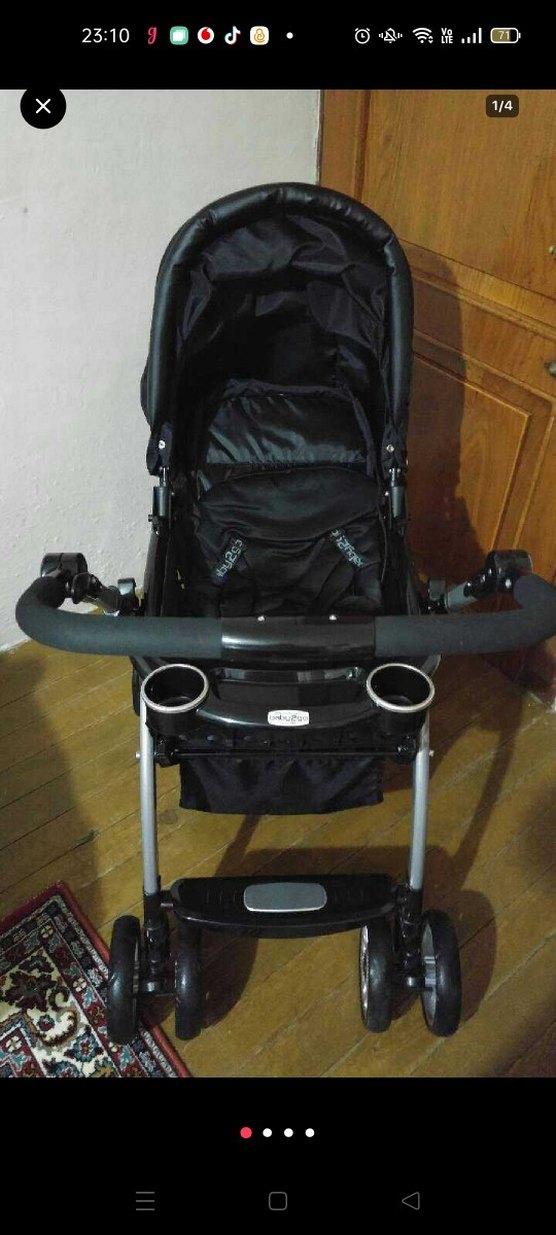 Sağlam gövdeye, yastıklı oturma kısmına ve kullanışlı çift bardak tutucusuna sahip siyah bebek arabası. Kolay kullanımlı ve konforlu.