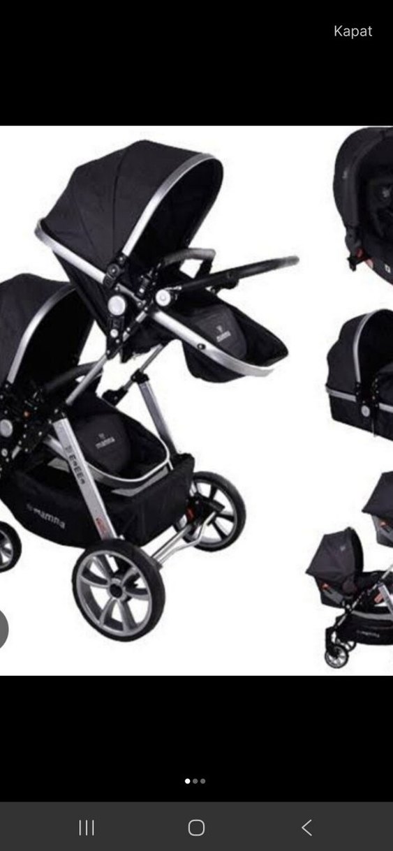 Siyah bebek arabası, sağlam çerçeve ve ayarlanabilir tente ile konfor sağlar. Büyük tekerlekleri ve alt kısmında saklama sepeti vardır.2 kucuk puset ve 2 büyük puseti vardır pusetlerin ikisi de içe ve dışarı dönük olabiliyor. çocuklarım büyüdüler o yüzden satiyorum