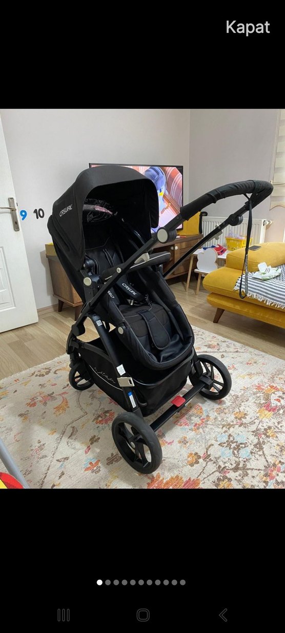 Siyah bebek arabası, ayarlanabilir tente, güvenlik kemerli rahat koltuk ve kolay hareket için büyük tekerleklerle donatılmıştır. Altında saklama sepeti bulunur. kullanilmistir.ama temizdir.