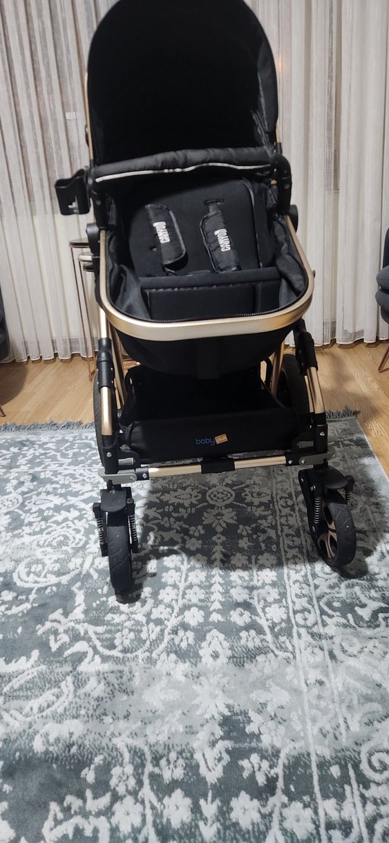 Siyah bebek arabası, sağlam çerçeve ve güvenli oturma kayışları ile rahat kullanım sağlar. Ön tekerlekleri döner, kolay yönlendirme sunar.