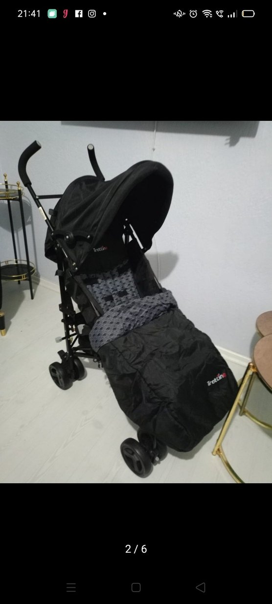 Koyu siyah renkte, tente ve yastıklı ayak örtüsü olan bebek arabası. Konfor ve koruma sağlar.