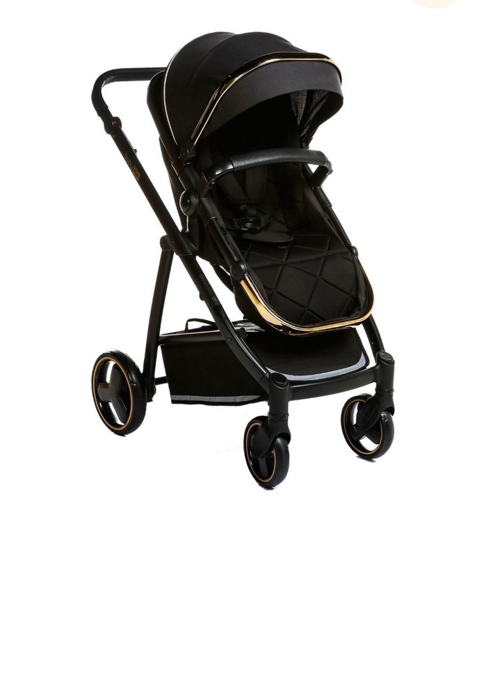 Dayanıklı çerçeveli, yastıklı oturma alanı ve tente ile siyah bebek arabası. Altında saklama sepeti bulunur.