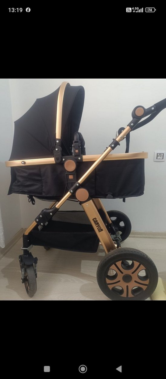 Siyah bebek arabası, altın detaylı sağlam çerçeve ve geniş beşik içerir. Büyük tekerlekleriyle rahat hareket sağlar ve tente bulunur.
