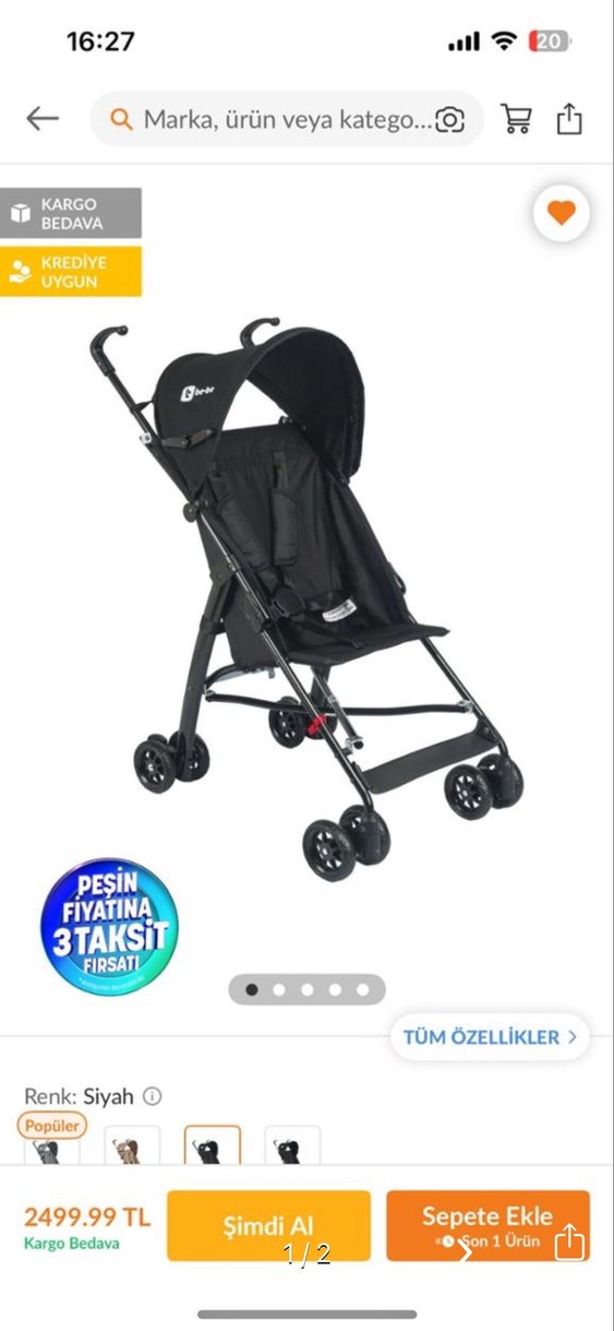 Siyah renkte, hafif ve katlanabilir bebek arabası. Gölgelik ve güvenli emniyet kemerleri bulunur. 3 taksit imkanıyla satın alınabilir.