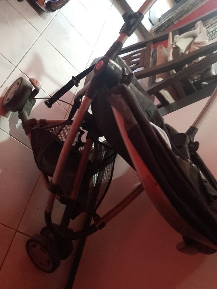 siyah renginde, katlanabilir çerçeveli ve alt kısmında file saklama sepeti bulunan bebek arabası
