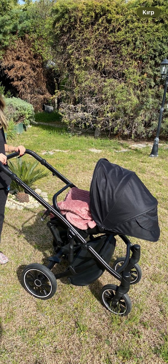 Bu siyah bebek arabası koyu renk tente ve sağlam çerçeveye sahiptir. Dört tekerlekli ve altında geniş bir saklama sepeti bulunur.