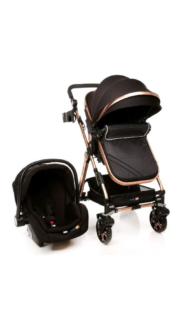 Dayanıklı iskeletli ve gölgelikli siyah bebek arabası ile güvenli seyahat için oto koltuğu seti. Tekerlekleri rahat sürüş sağlar.