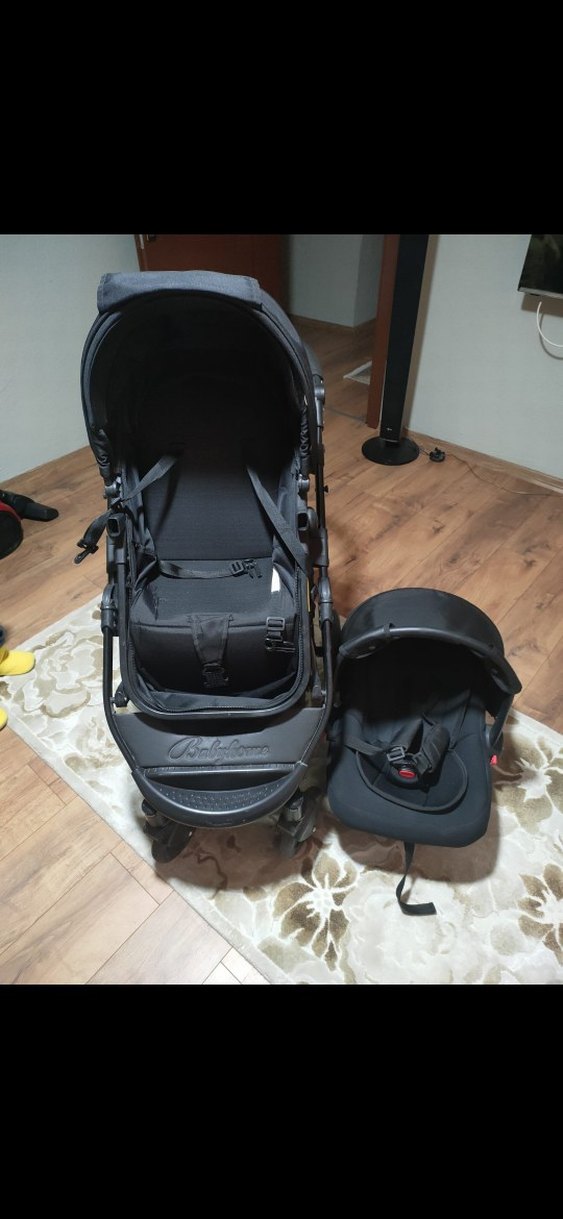 Siyah bebek arabası ve uyumlu taşıma koltuğu. Her ikisi de güvenli kemerler ve sağlam iskelet yapısına sahiptir. Arabada tente ve ayak dayanağı bulunur.