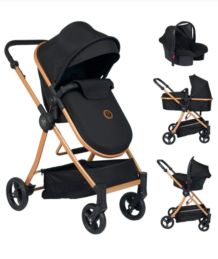 Siyah bebek arabası, koyu renk çerçeve ve uyumlu taşıma koltuğu ile. Mamma Force 6 in 1 model