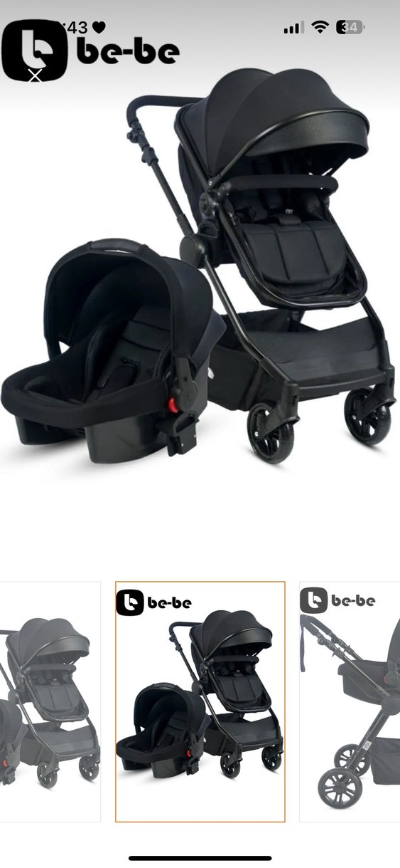 Koyu siyah renkte, sağlam yapılı ve kolay hareket eden tekerlekli bebek arabası ve uyumlu taşıma koltuğu. Emniyet kemeri ve tente bulunur.