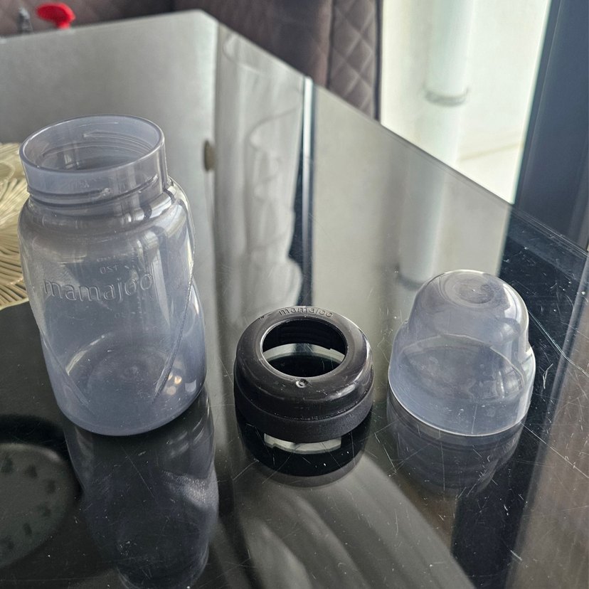 mamajo,Siyah bebek biberonu, halka ve silikon emzikten oluşan parçalar ayrı ayrı yerleştirilmiştir.