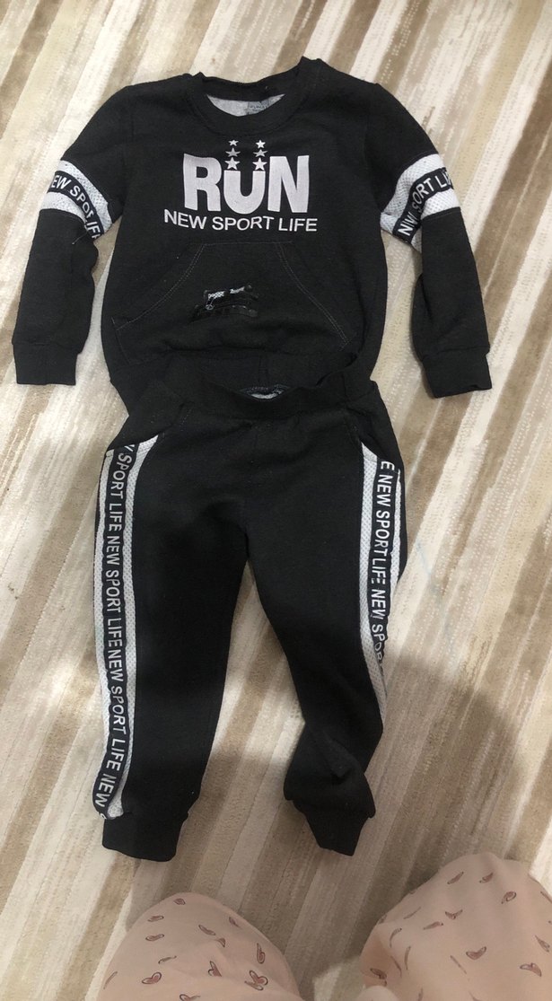 Siyah, uzun kollu ve bisiklet yaka bebek eşofman takımı. Baskılı yazılar ve velcro detaylı, yumuşak ve sıcak kumaştan üretilmiştir. Etiket yasi 4 ama 3 yasa daha uygun