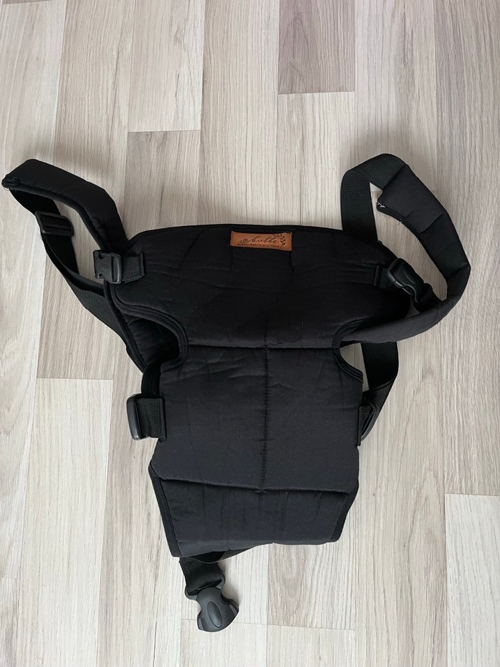 Ayarlanabilir kayışlara ve rahatlık için dolgulu desteğe sahip siyah bebek taşıyıcı. Trendy.l dan alındı. 6-7 kiloya kadar çok rahat kullandık. Bebeği tam vücuda sabitliyor. Yumuşak kumaş bebeği sıkmıyor.Bacaklar M şeklinde kalıyor.