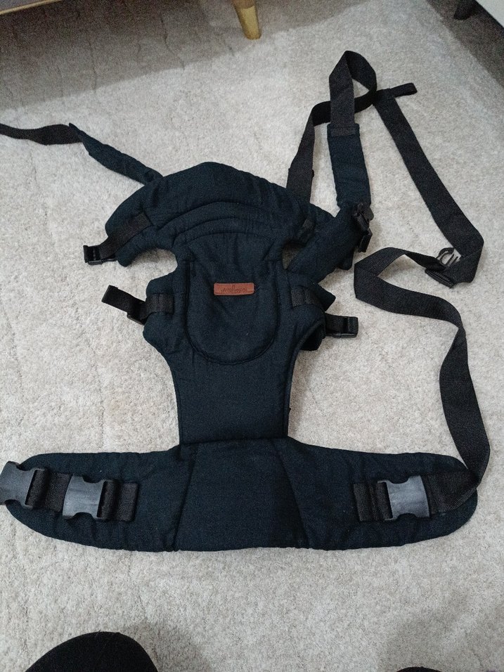 Ayarlanabilir kayışları ve güvenli tokaları olan siyah bebek taşıyıcı. Rahat kullanım sağlar.