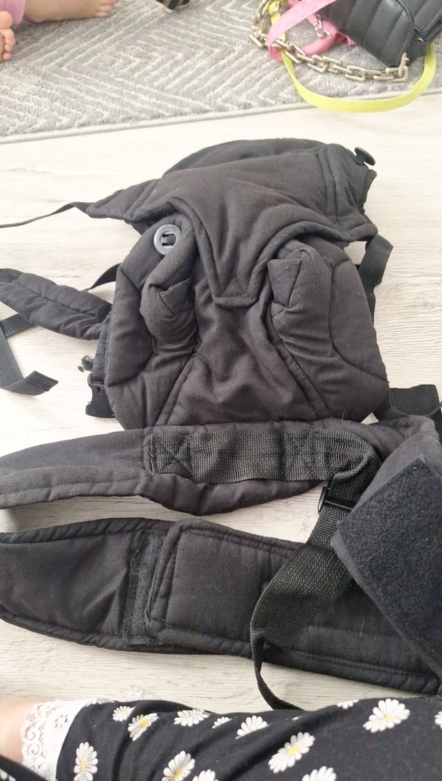 Siyah renkte, ayarlanabilir ve dolgulu askılarıyla rahat ve güvenli bebek taşıma aparatı.