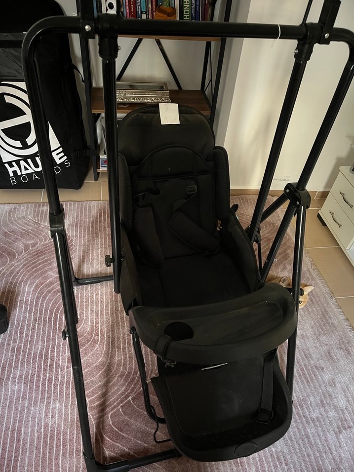 Siyah renkli, sağlam çerçeveli ve emniyet kemerli rahat oturma alanına sahip bebek mama sandalyesi. Yemek ve oyun için tepsisi vardır. Temizlenip gönderilecektir Üst tentesi mevcut değildir İsteyene video atılacaktır