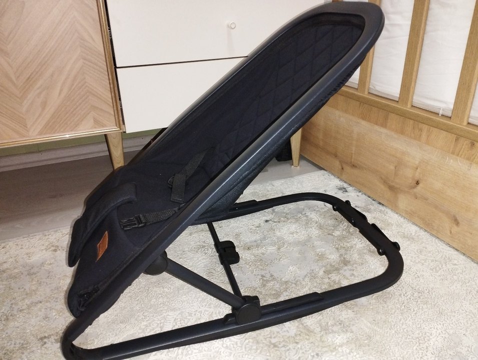 Dayanıklı çerçeveli, rahat dolgulu oturma alanı ve güvenlik kemerleri bulunan siyah bebek mama sandalyesi. Şık ve sade tasarım.