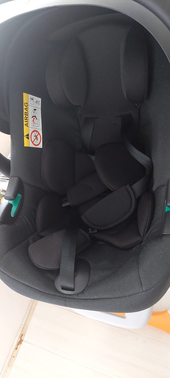 Siyah bebek oto koltuğu, güvenli ve rahat seyahat için yastıklı kayışlar ve dolgun iç kısım içerir. Ayarlanabilir kemerler ve güvenlik etiketi mevcuttur.