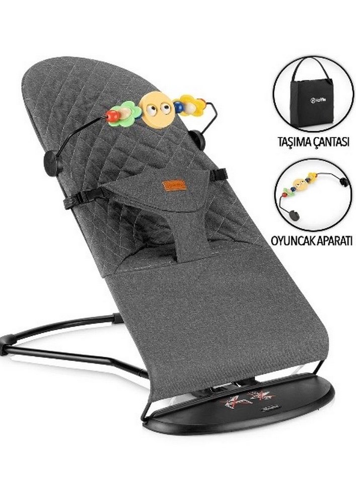 Siyah, yastıklı oturağa sahip bebek sling, önünde renkli çiçek şeklinde oyuncaklar bulunur. Kapitone dokulu ve ayarlanabilir kayışlı.