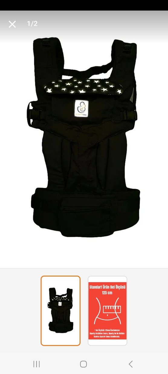 Siyah renkte, 125 cm standart bel ölçüsüne sahip bebek taşıyıcıdır. Ayarlanabilir kayışlarla rahat ve güvenli kullanım sağlar. az kullanıldı