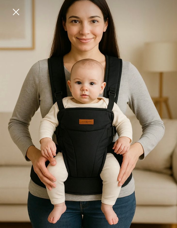 Ayarlanabilir askılı, yumuşak kumaşlı siyah bebek taşıyıcı. Bebekler için önde taşıma desteği sağlar.