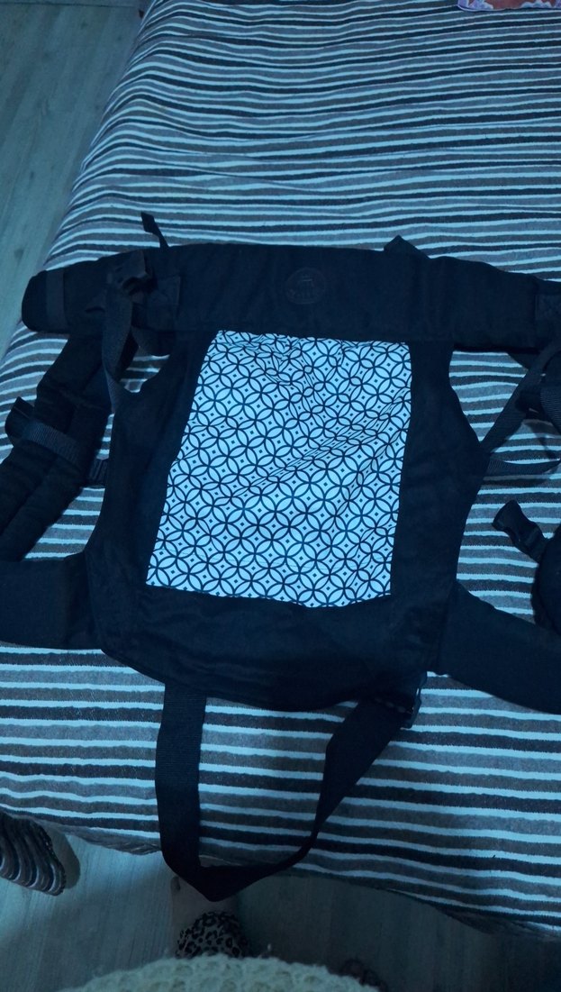 Ayarlanabilir askıları ve desenli ön paneli ile siyah bebek taşıyıcı, güvenli ve rahat taşıma sağlar.