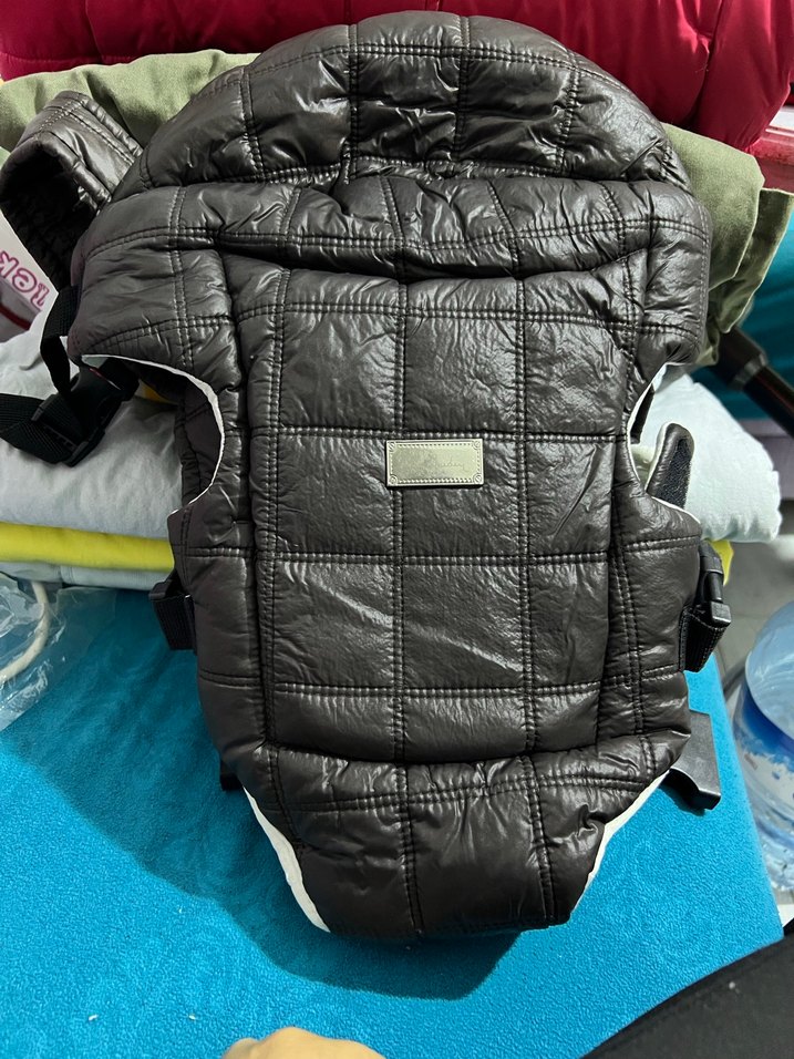 Ayarlanabilir kayışlı, kapitone dikişli siyah bebek taşıyıcı, konforlu ve destekleyici tasarıma sahiptir.