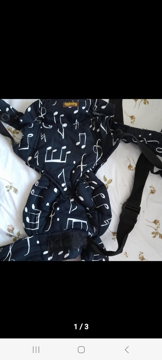 Müzik notalı desenli siyah bebek taşıyıcı, ayarlanabilir kayışlar ve rahat taşıma için yumuşak kumaş içerir.