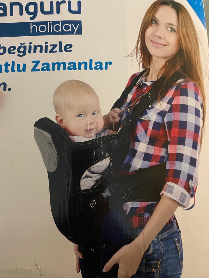 Siyah bebek taşıyıcı kanguru, destekleyici askılar ve nefes alabilen yan kısımlarla bebeğinizi rahat ve güvenli taşır.