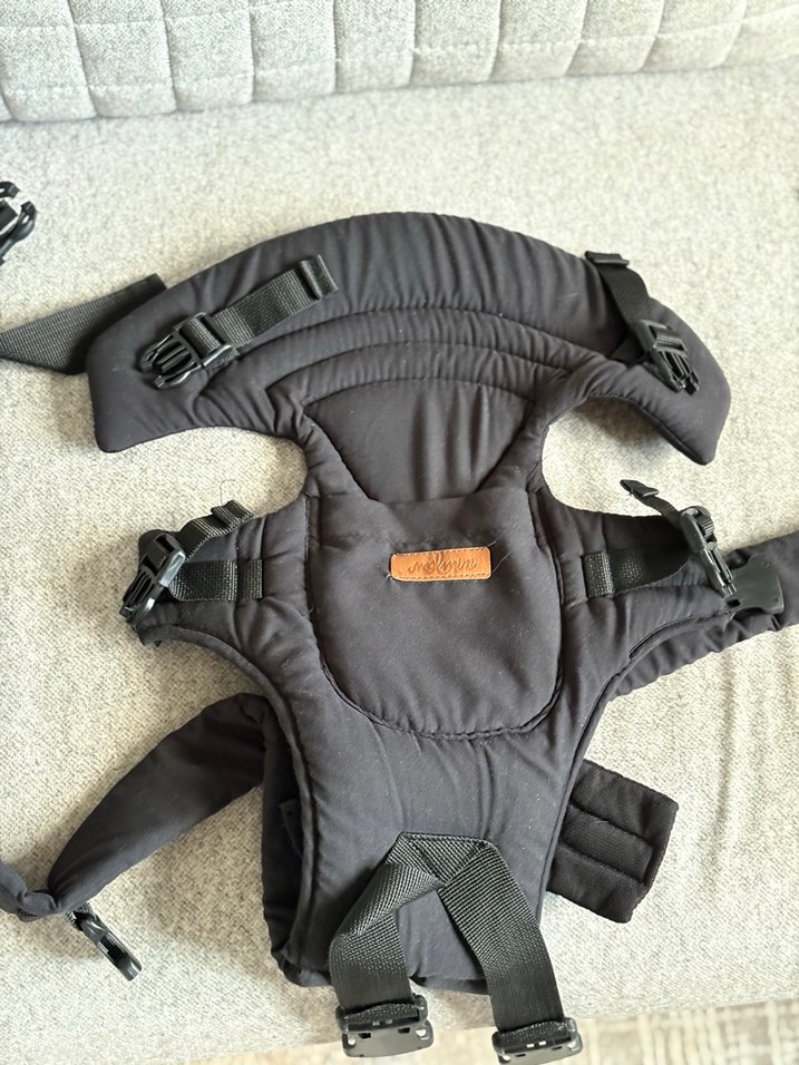 Ayarlanabilir kayışlara sahip siyah bebek taşıyıcı kanguru, bebeği güvenli ve rahat taşımaya uygundur. Eller serbest kalır.