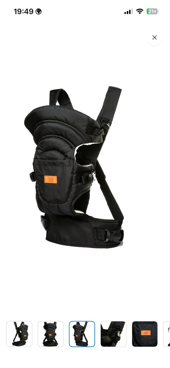 Siyah renkli, ayarlanabilir tokalı ve dolgulu askılı bebek taşıyıcı kanguru. Bebeği güvenli şekilde taşımaya olanak sağlar.