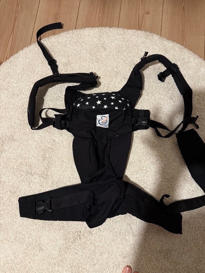 Ayarlanabilir kayışlara sahip siyah bebek taşıyıcı, ön panelde yıldız deseni bulunur. Rahat taşıma sağlar.