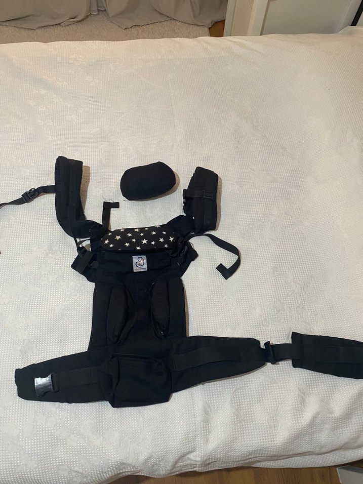Ayarlanabilir askılı, yumuşak destekli siyah bebek taşıyıcı. İç kısmında yıldız desenleri bulunur. Güvenli taşıma sağlar.