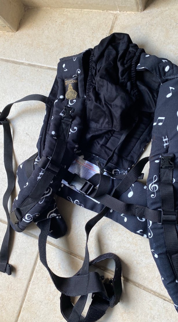 Ayarlanabilir kayışlara sahip, müzik notaları desenli siyah bebek taşıyıcı.