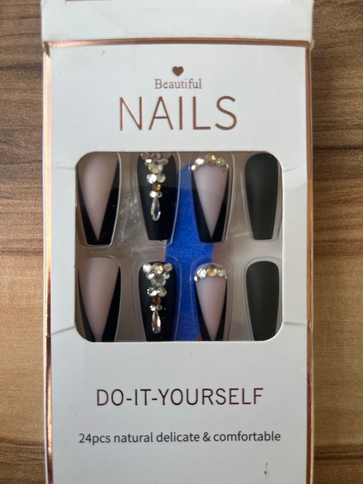 24 parça siyah tırnak süsü, doğal ve rahat yapısıyla rhinestone detaylar içerir.