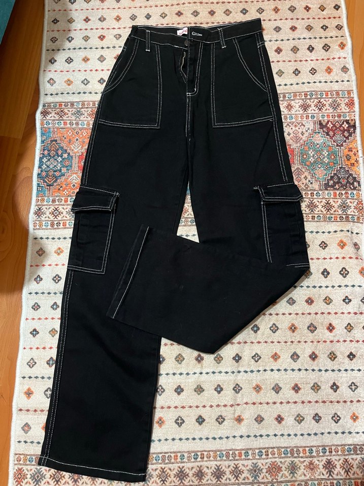 Siyah renkte, bel detaylı, bol kesim ve midi boy kot pantolon. Çok cepli, günlük sokak stili için uygun.