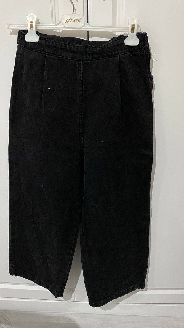 Siyah, bol kesim, bel detaylı midi uzunlukta kot pantolon. Günlük sokak stiline uygun rahat tasarım.