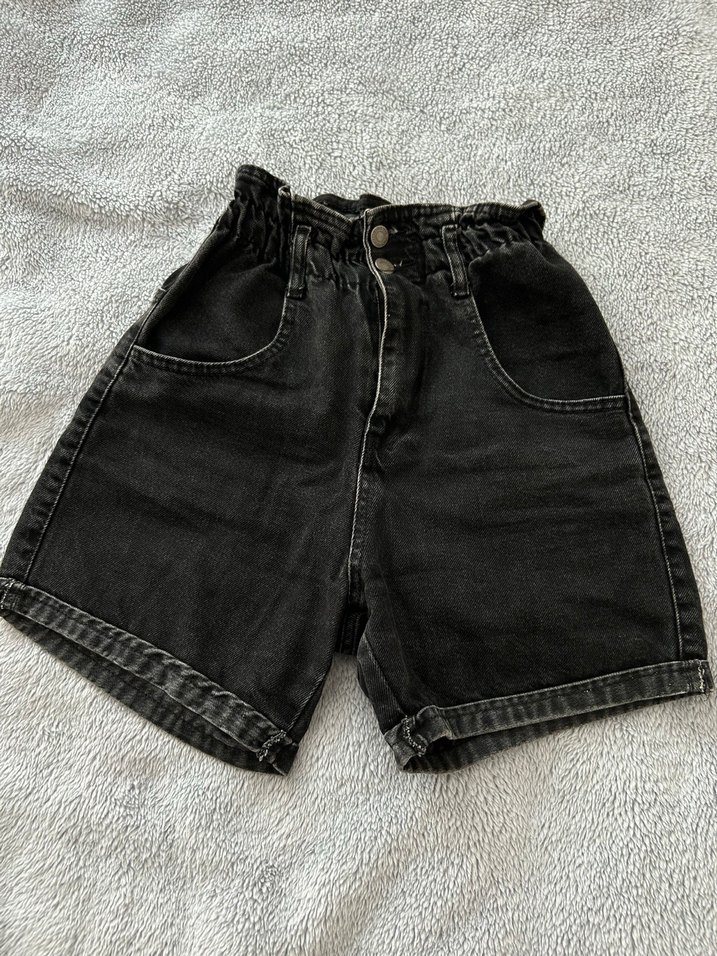 Siyah kot kumaştan, bel detaylı bol kesim mini şort, günlük kullanım için uygun rahat sokak tarzı.